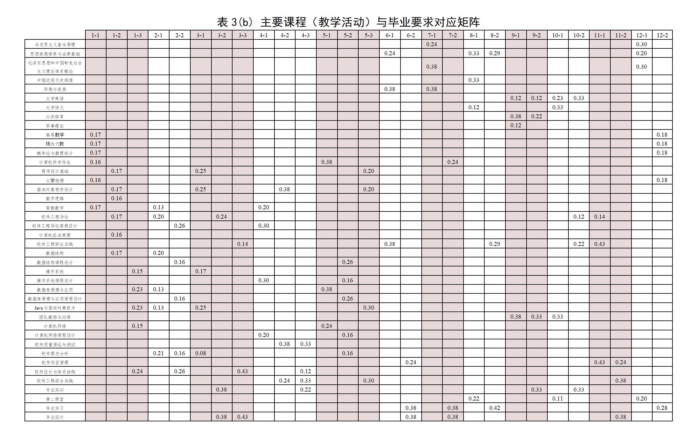 主要课程:高等数学、线性代数、概率论与数理统计、计算机科学导论、程序设计基础、大学物理、面向对象程序设计、数字逻辑、离散数学、软件工程导论、计算机组成原理、软件工程职业实践、数据结构、操作系统、数据库原理与应用、Java与面向对象技术、团队激励与沟通、软件设计与体系结构、软件需求分析、计算机网络、软件质量保证与测试、软件项目管理等。