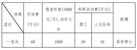 根据学科专业和学术水平,学校提供引进费20-60万元,科研启动费理工类专业8-20万元,租房补贴1000元/月(共补2年)。特别优秀的博士以及博士教授“一事一议”。