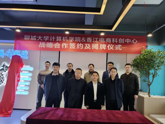 为深度推进校企融合,培养电商人才,带动大学生的创业热情,计算机学院与香江电商科创中心于12月9日进行座谈研讨,签署《战略合作协议》,开展基地成立揭牌仪式。聊城光彩置业总经理董海峰,香江管委会书记李新胜,香江管委会主任高忠峰,明发体育院长孟晗,计算机学院副院长李成友,计算机学院办公室主任李树榜,电子商务系主任刘广亮,教师、博士李德奎,计算机学院团委辅导员田飞,亚马逊聊城运营中心总监朱阳合,拓展总监李飞等一众领导莅临现场,共同见证了这一重要时刻。