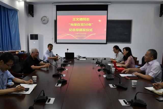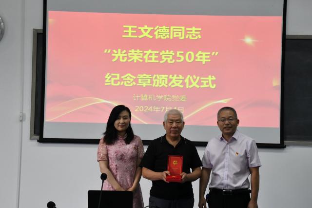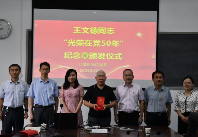 为庆祝中国共产党成立103周年,弘扬伟大建党精神,进一步增强广大党员的荣誉、归属感、使命感,7月4日上午,计算机学院举办王文德同志“光荣在党50年”纪念章颁发仪式。“光荣在党50年”老党员王文德同志、学院党委班子成员、党员代表参会活动,党委书记贾仰理主持。